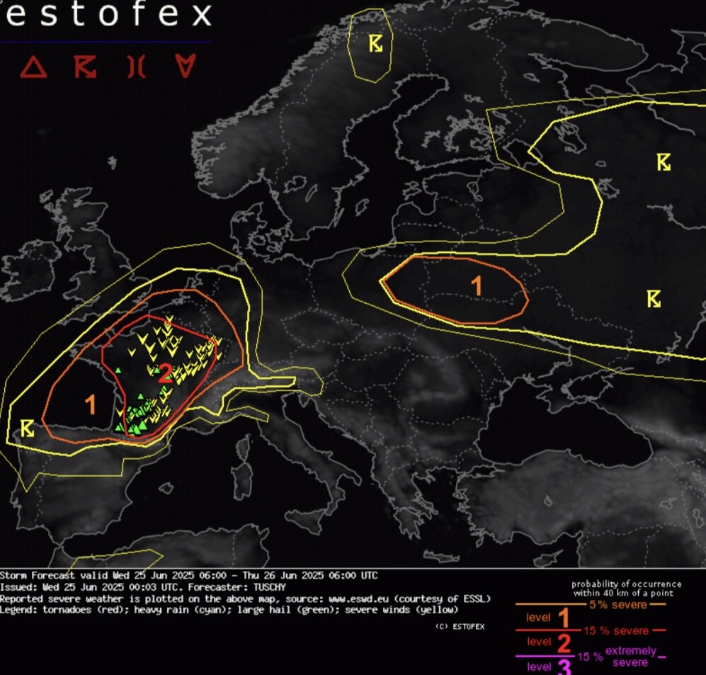 Niveau 2 pour Estofex sur une large partie du pays, avec plusieurs MCS possibles : La carte des risques convectifs ASTORP: -