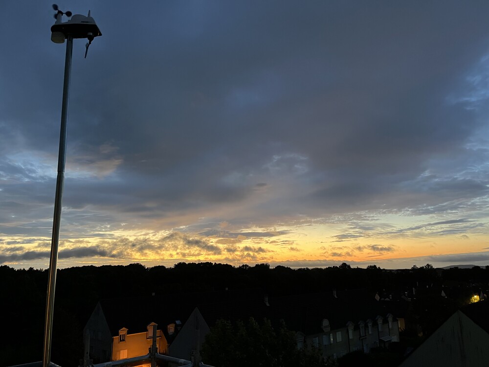 Ciel un peu chaotique ce matin dû aux quelques orages au nord-ouest. Un petit vent de nord-ouest bienvenu avec une température de 22°C actuellement à Cergy le haut. Tn de 19°C. Bref, temps très agréable ce matin !