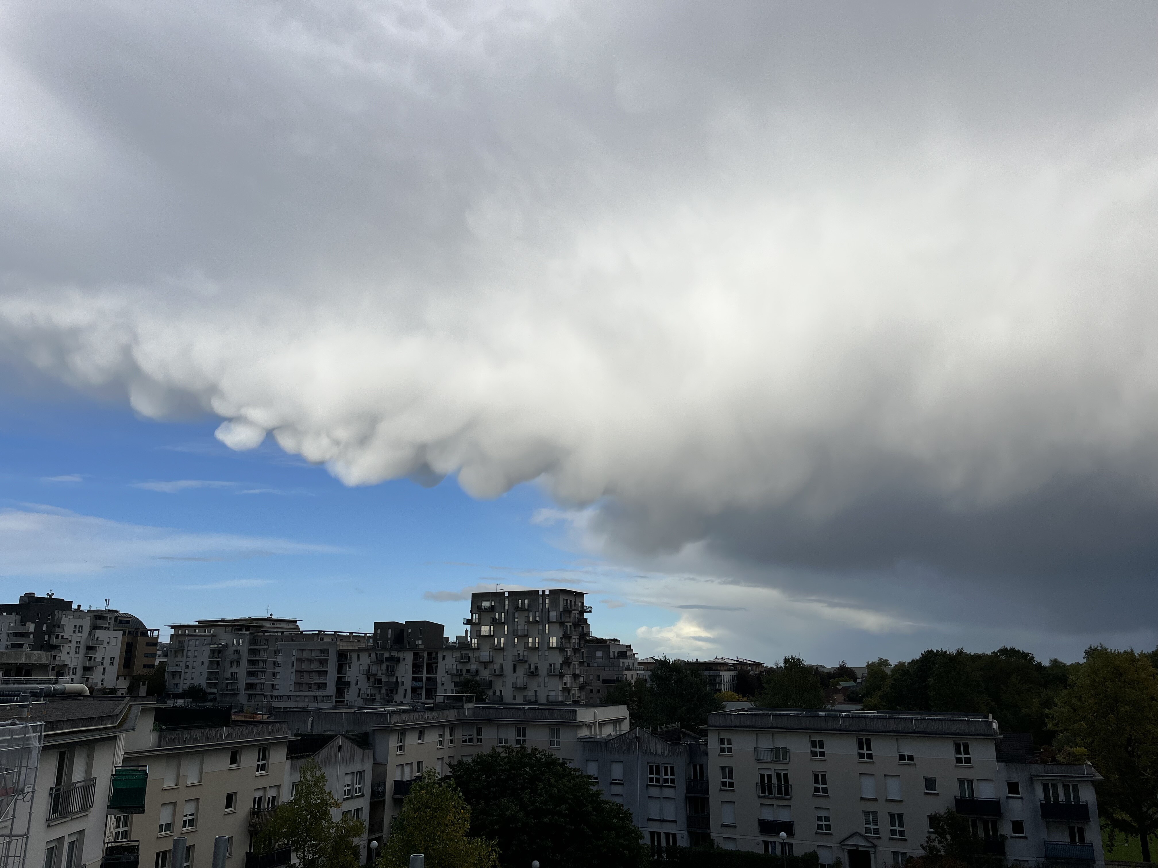 Ciel un peu chaotique ce matin dû aux quelques orages au nord-ouest. Un petit vent de nord-ouest bienvenu avec une température de 22°C actuellement à Cergy le haut. Tn de 19°C. Bref, temps très agréable ce matin ! -
