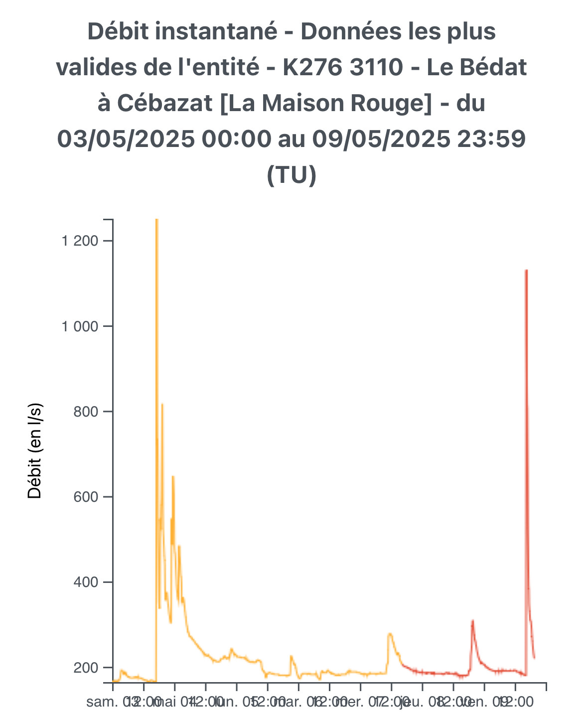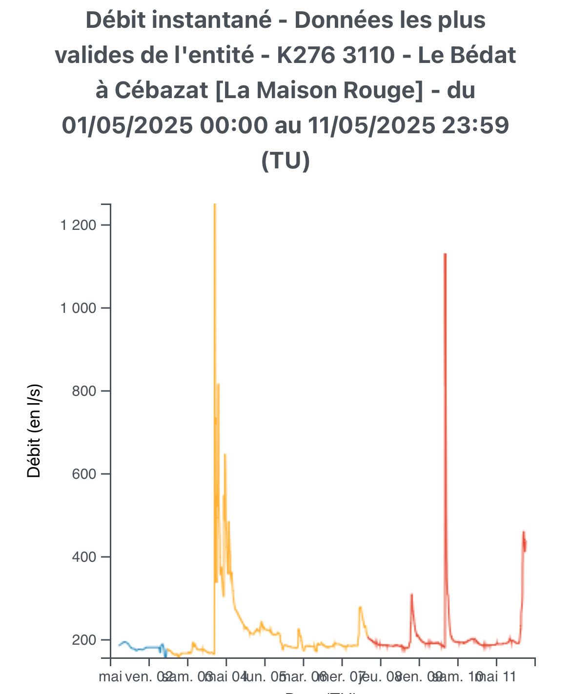 Ce temps faiblement orageux c’est sympa, mais assez frustrant pour ceux qui passent à travers. Si on résonne en terme de bassin versant, avec une zone plus large donc, on a plus de chances d’avoir un impact (dans tous les termes) de ces « orages ». Pour aujourd’hui : Pour ces quelques derniers jours (depuis le 3 mai) : C’est pas énorme, mais ça permet de garder un débit « honnête ». -