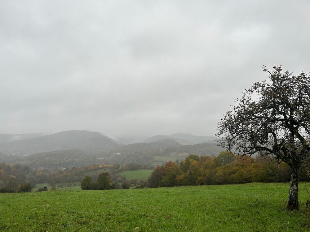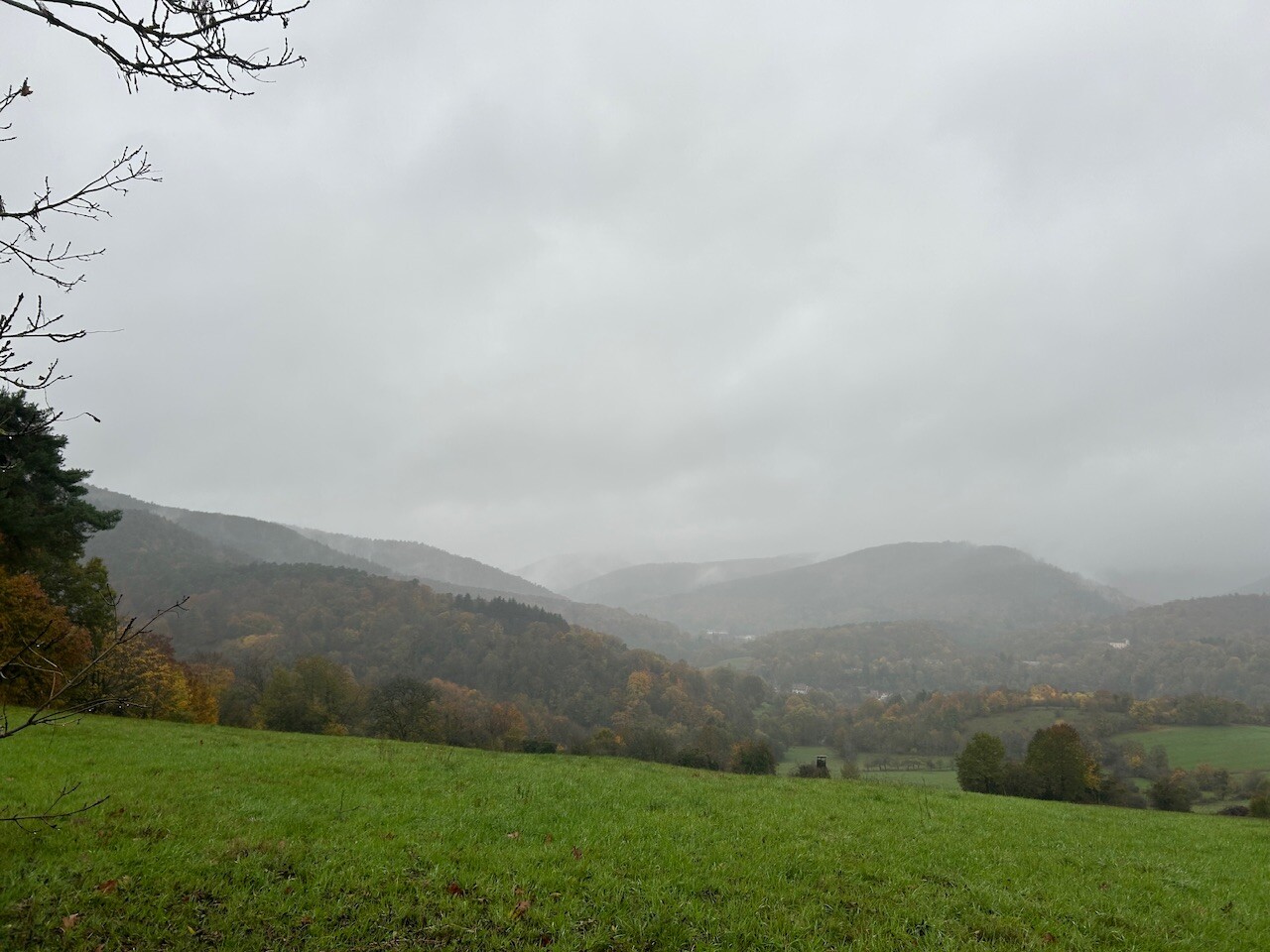 Pas mal de pluie à nouveau cette nuit avec 8,0mm depuis 0h à ma StatIC de Schleithal. Le cumul mensuel atteint et dépasse même la normale avec 86,0mm à cette heure dont 72,4mm sur l’épisode (normale 84,2mm) 🙂. Frais mais loin d’un ressenti hivernal avec 6,9° actuellement (Tn 6,6°). Je suis actuellement sur les hauteurs de Climbach à environ 380m d’altitude et il bruine avec de la brume. Le thermo du fourgon indique 5° (4,8° actuellement à notre sonde du Wintersberg à 580m, en hausse lente depuis hier soir et la Tn de 3,5° à 23h). Photos prises en montant le Col du Pigeonnier à environ 280m d’altitude direction Weiler en contrebas: -